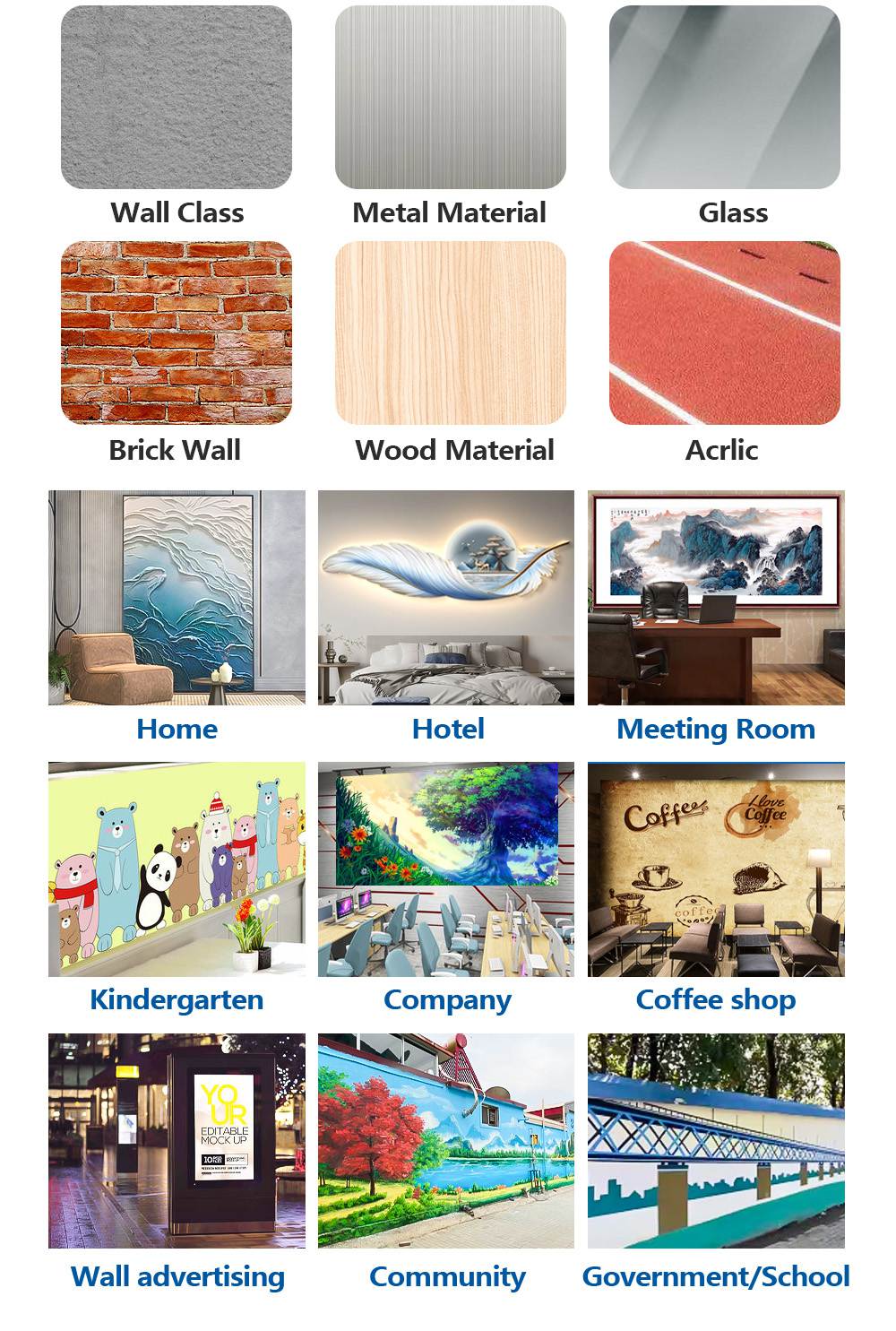1.Can Be applied to a variety of materials wall, for example White Wall, LATEX PAINT WALL, Shell powder wall, ceramic tile, glass KT board, metal,canvas wall.